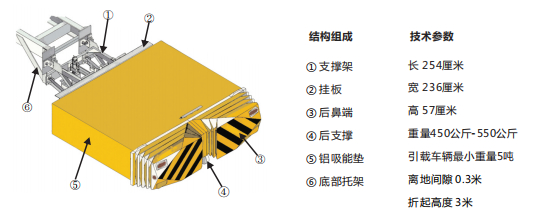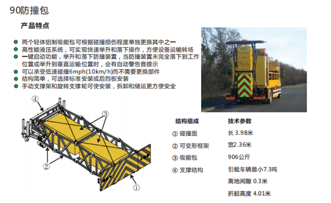 采用美國Energy Absorption Systems公司原裝進口的Alpha 70K TMA™防撞緩沖模塊。輕體鋁制吸能包可根據碰撞損傷程度單獨更換。一鍵啟動功能,舉升和降落防撞裝置時當未完全到位時會有自動報警提醒。可承受速度為70 Km/h,質量為2噸重的車輛撞擊產生的能量,并可在承受低速(6mph或10km/h)碰撞時而不需要更換部件,最大限度降低用戶的使用成本。